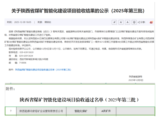近日,陕西省能源局公布了关于陕西省煤矿智能化建设项目验收结果的公示(2025年第三批),陕西能源冯家塔矿业运营有限责任公司位列其中。