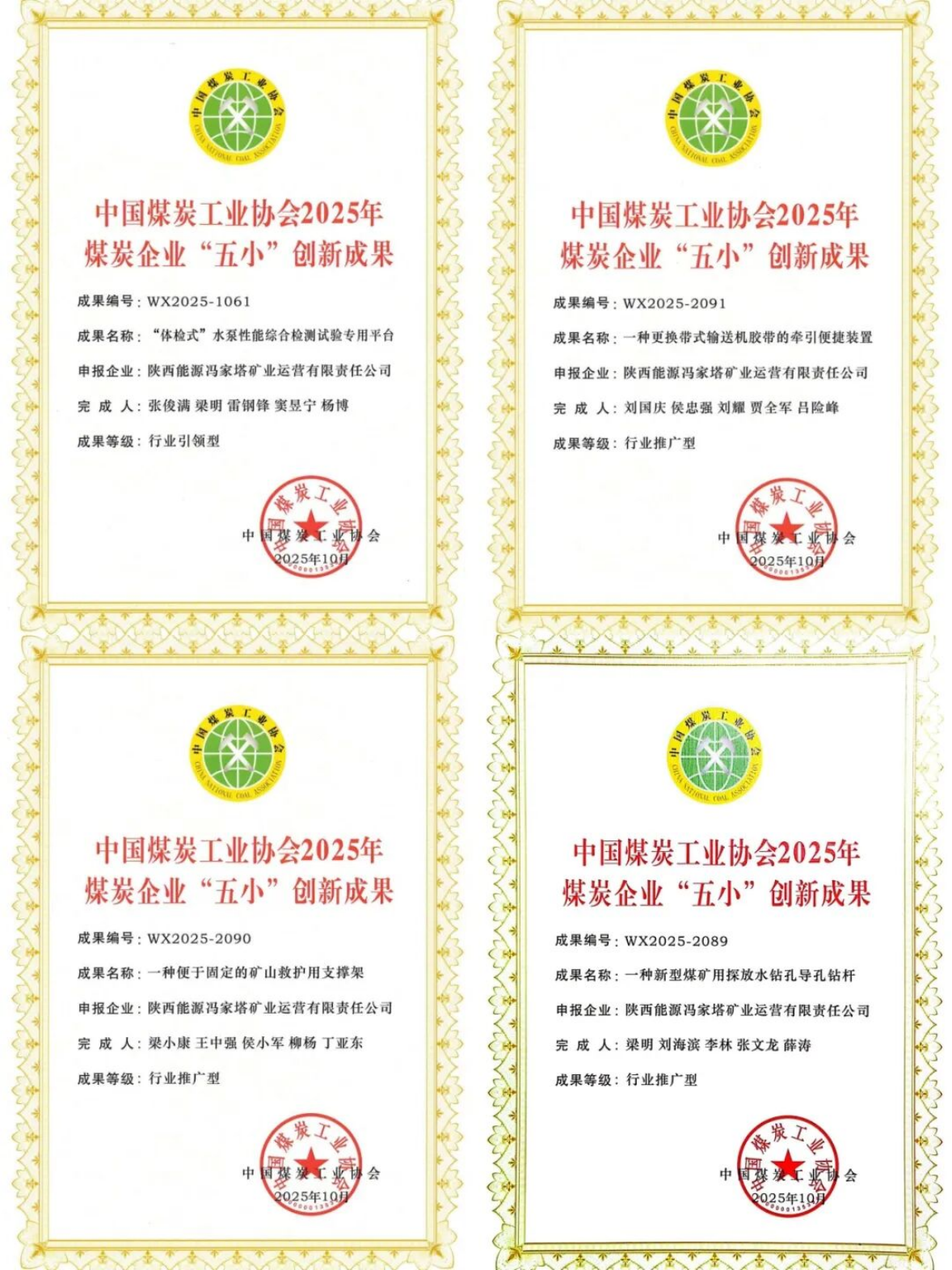 冯家塔运营全年发表省级及以上学术论文35篇、申报实用新型专利14项、授权专利2项。2项科技成果被鉴定为“国际先进”水平,4项创新成果获评中国煤炭工业协会煤炭企业“行业引领型”“行业推广型”五小创新成果荣誉,并精彩亮相国际煤炭采矿技术展。11项创新成果斩获陕投集团首届职工“五小”创新大赛奖项。此外,已申报陕西省煤炭科技创新先进单位、先进个人及第二届陕西省煤炭科学技术奖,创新驱动发展氛围日益浓厚。