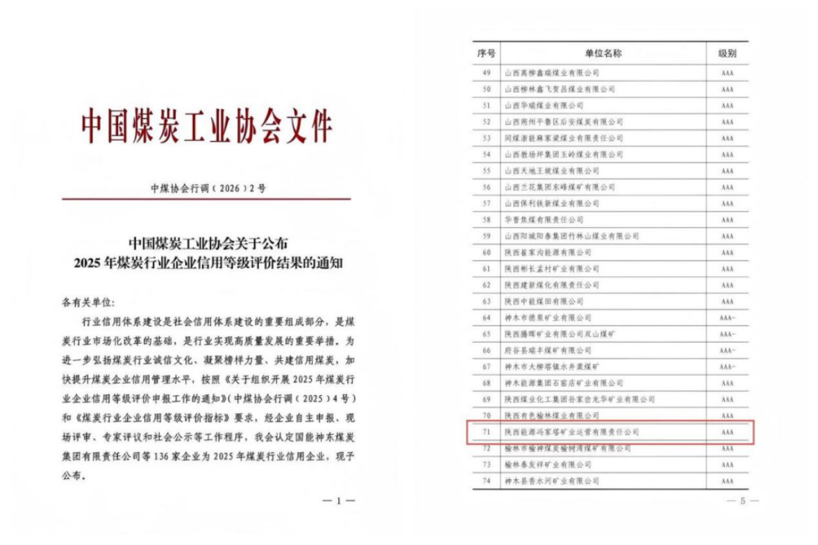 近日,中国煤炭工业协会公布2025年煤炭行业企业信用等级评价结果,冯家塔运营凭借规范经营、坚实合规根基与突出社会责任,顺利通过严格评审,荣获3A级信用企业称号。煤炭行业企业3A级信用等级是中国煤炭工业协会评定的行业最高信用等级,综合考量企业经营、管理、合规、履约等多维度表现,是衡量企业市场公信力的重要标杆,此次获评标志着冯家塔运营合规诚信经营跻身行业先进行列。