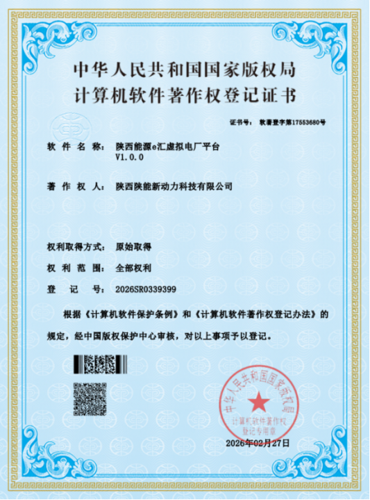 近日,能动科技成功获得“陕西能源e汇虚拟电厂平台V1.0.0”计算机软件著作权登记证书。这是继“陕投集团充换电智慧运营管理平台V1.0.5”“智慧充换电服务小程序V1.0.0”等软件著作权之后,能动科技在新能源数智化领域取得的第六项软件核心成果。