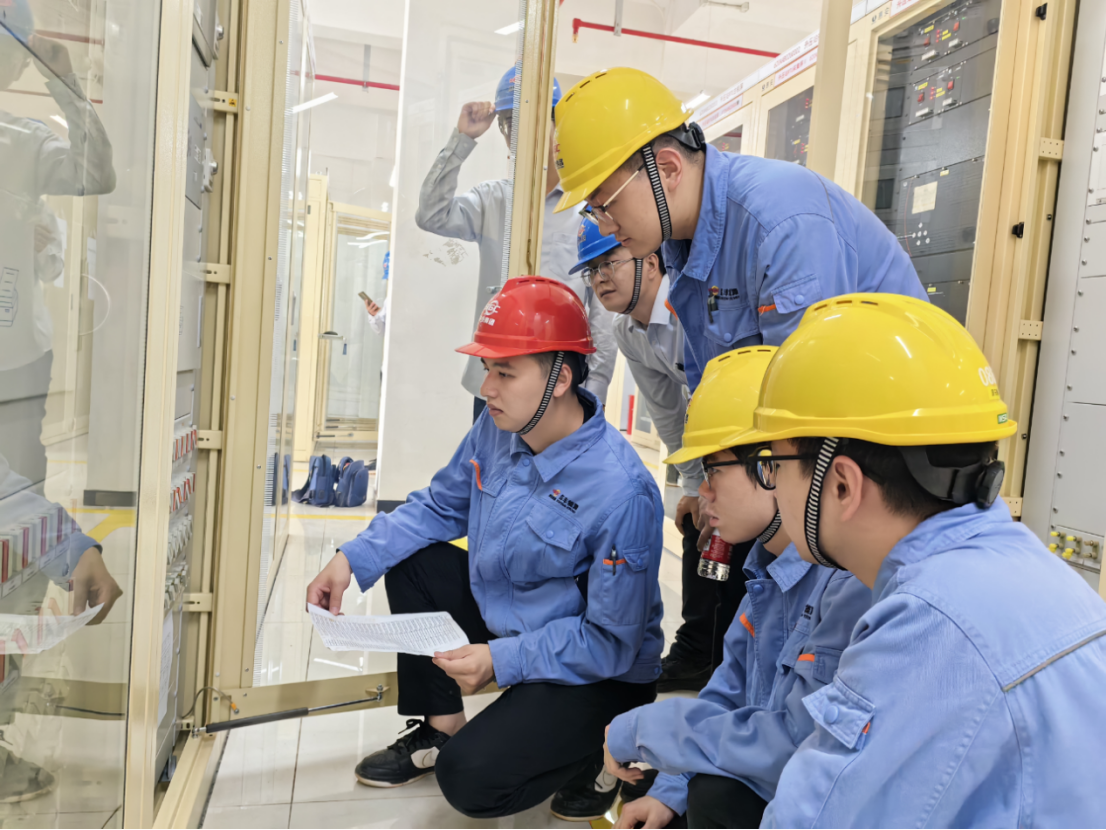 本次受电的500kV升压站采用“π接”方式接入现有赣州变电站和雷公山变电站,既是信丰能源机组外送通道,又是赣州变和雷公山变的电力输送通道联络枢纽。面对工期紧、任务重的挑战,为确保厂用电受电平稳有序,信丰能源成立工程试运指挥部,统筹多方参建力量,细化分工、明确时限,科学安排建设工期,昼夜奋战,高效完成了“远雷线”和“远赣线”全部“π接”及调试工作,为项目整体推进赢得了宝贵时间。并围绕调度通信与数据传输开展专项攻坚,一次性高标准通过省调、网调验收,为受电操作指令精准下达、工况全程监控、安全应急处置提供坚实可靠保障。同时,组织所有运行人员认真学习倒送电方案、反事故措施,编写典型操作票100余份,针对重要操作开展专题培训并多次进行模拟预演,关键设备检查和操作明确到人,受电过程操作规范有序、精准到位,实现了全过程“零失误”,圆满实现倒送电“一次成功”目标。
