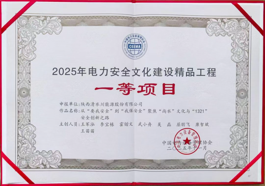 11月14日,从中国电力设备管理协会传来捷报,清水川能源申报的《从“要我安全”到“我保安全”聚焦“尚水”文化与“1321”安全创新之路》电力安全文化建设项目,在2025年全国电力安全文化精品工程评选中脱颖而出,斩获一等奖殊荣。