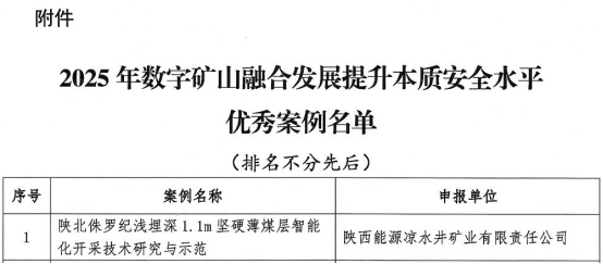 近日,2025年数字矿山融合发展提升本质安全水平典型案例名单正式公布,凉水井矿业《陕北侏罗纪浅埋深1.1m 坚硬薄煤层智能化开采技术研究与示范》项目成功入选。