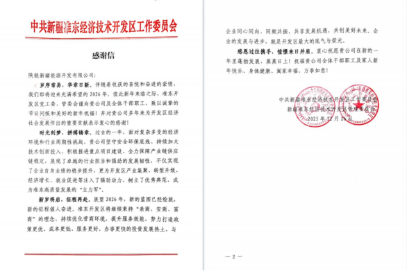 12月30日,陕能新疆收到来自准东经济技术开发区党工委、管委会的感谢信。信中对公司长期以来为开发区经济社会发展所作出的重要贡献表示衷心感谢,并对在过去一年中展现的国企责任担当与发展韧性给予高度肯定。